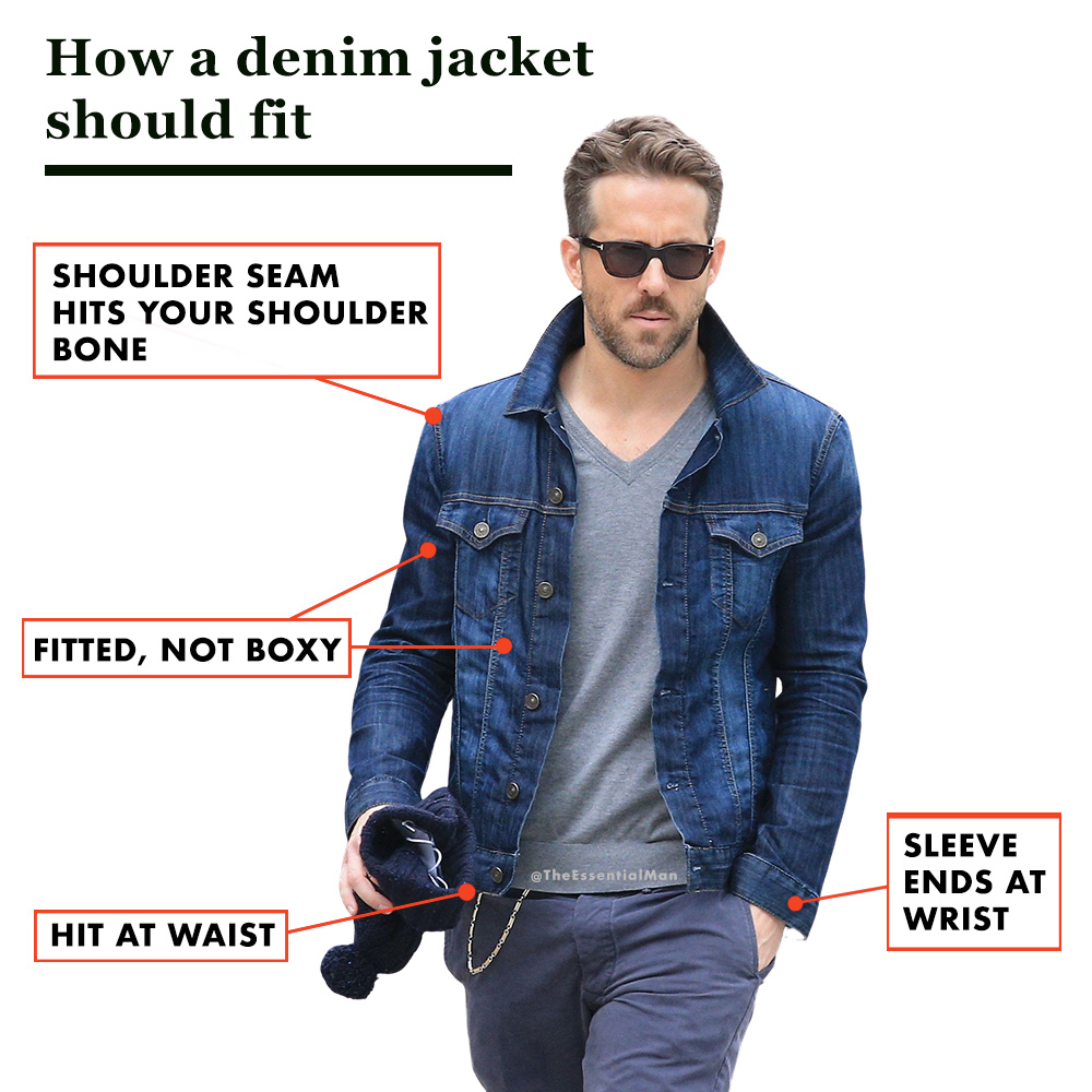 Piensa ajustado Tu chaqueta de mezclilla debe seguir las reglas clásicas de cómo debe quedarte una chaqueta. Las costuras de los hombros deben alinearse aproximadamente con la punta del hueso del hombro. No demasiado apretado donde no se puede abotonar. Ligeramente ahusado a lo largo de los costados para una apariencia recortada.