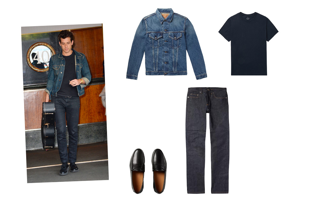 No le temas al esmoquin canadiense. Es mucho más fácil de lograr de lo que piensas. Si lo haces bien, lucirás extremadamente confiado en tu habilidad para lucirte. Siga el ejemplo del productor Mark Ronson y mezcle sus tonos de mezclilla. Si tu chaqueta es clara, opta por unos jeans más oscuros. Si tu chaqueta es un índigo oscuro, puedes hacer un poco de trampa y combinarla con jeans grises o negros.