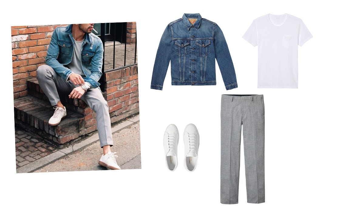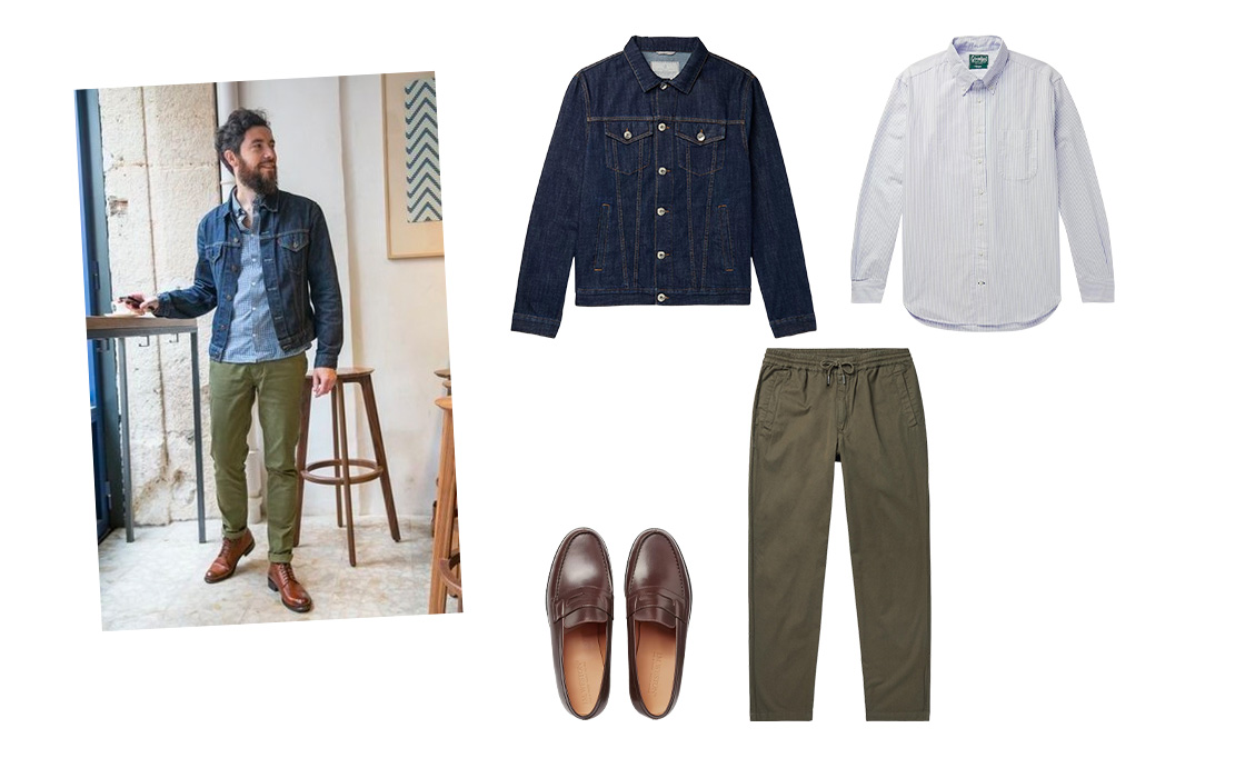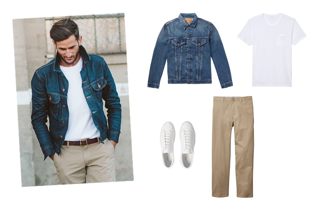 También me encanta combinar una chaqueta de mezclilla con una camisa abotonada. Es inesperado, y es una excelente manera de elevar el atuendo. Una camisa abotonada de color blanco sólido, azul pálido o gris son excelentes opciones. Mis favoritos personales son los botones de popelín de rayas finas, que tienen un patrón sutil. Si quieres descansar de las zapatillas de deporte, un buen mocasín usado de manera casual es una gran opción.