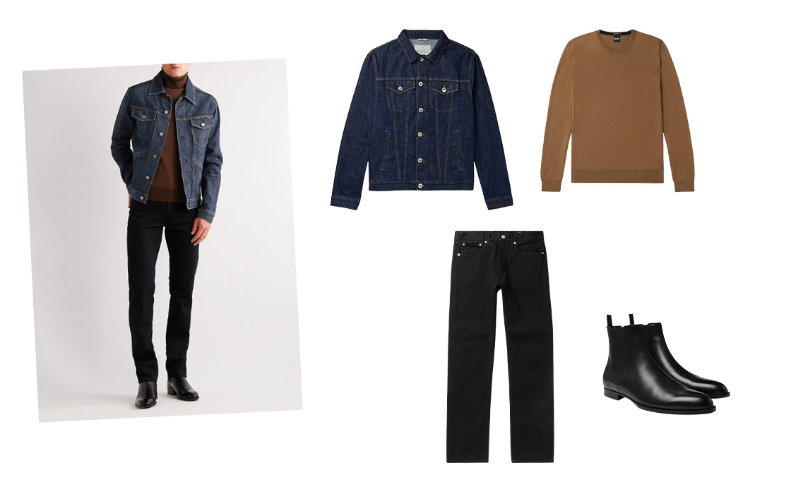 El ejemplo perfecto para mostrar lo versátil que puede ser una chaqueta vaquera. Con este look, apégate a una chaqueta de mezclilla más oscura, como el índigo oscuro o el negro. No es necesario que te pongas un jersey de cuello alto como el del ejemplo, pero opta por un buen suéter de lujo de calibre fino en algo como cachemir o una mezcla de seda. Mantén el ambiente de lujo con una bota más refinada y elegante como una Chelsea.